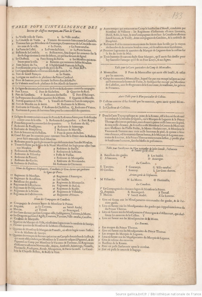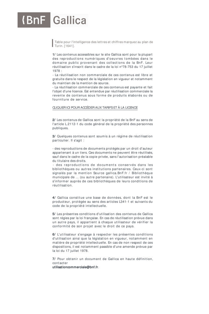 Table pour l'intelligence des lettres et chiffres marquez au plan de Turin